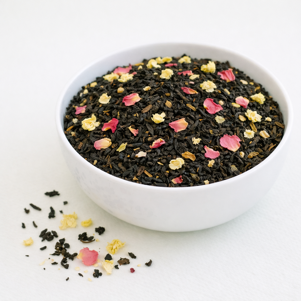 Du får her en mild bær smag og skøn duft af blomster. Farmors Blomster te er en af vores mest solgte aroma teer, og indeholder, udover sort te (93,5%), rosenblade (2%), kattepoteblomster (1,5%), lyngblomster (1%), birkeblade og aroma.