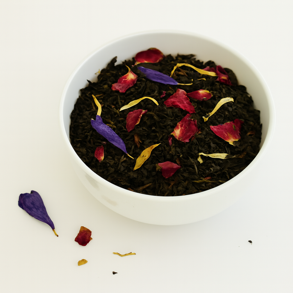 Kinesisk Forårs Te med bergamot-olie (som vi kender fra den klassiske Earl Grey) kombineret med jasminblomst og rosenblade giver en frisk, blomstret kop med ganske lette krydrede noter. Og så er den desuden en sand fryd for øjet! Er du ikke til jasminblomst og rosenblade, kan jeg anbefale vores Classic Earl Grey Te