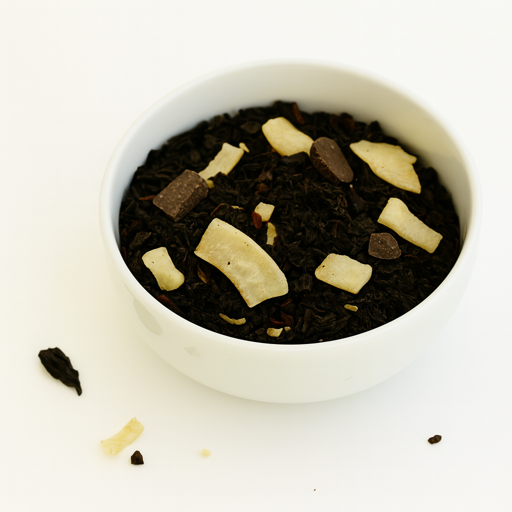 Den aromatiske sort te-blanding kombinerer mørk te med chokolade, hvid chokolade og kokosflager, hvilket giver en rund og let cremet karakter. En oplagt gaveidé eller selvforkælelse – især for dig, der elsker luksus te med sød smag.